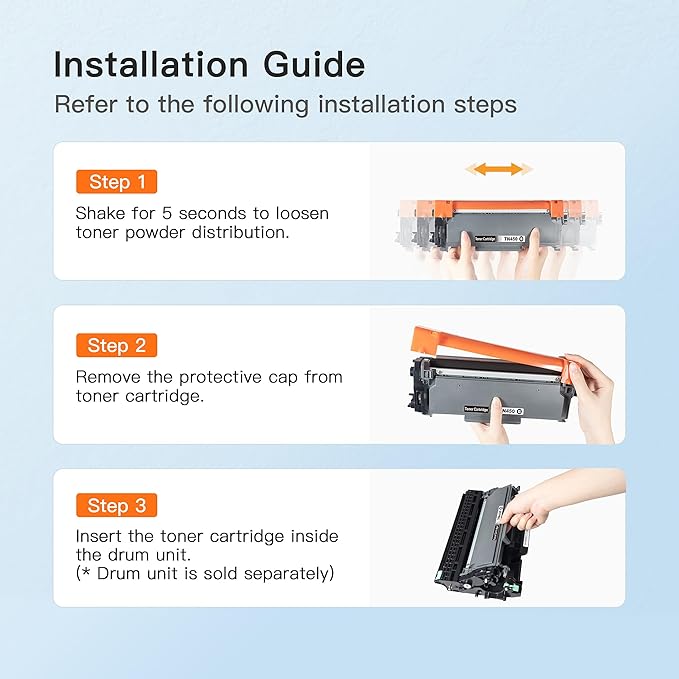 - Package Contents: 1 x User Guide, 2 x TN450 Black, 1 x DR420 Drum unit (Total 3 Pack)