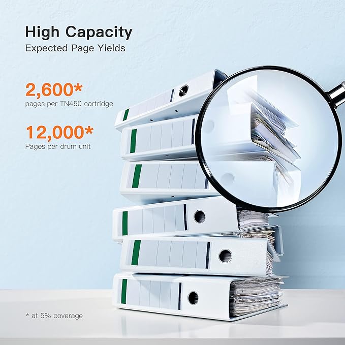 - Page Yield: Black is 2,600 pages per toner cartridge, and 12,000 pages per drum unit at 5% coverage