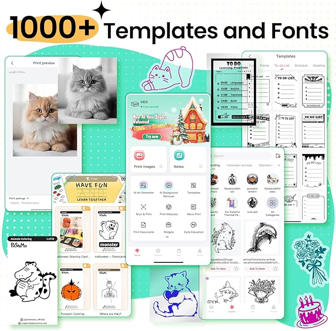 - Sticker Maker Machine with Powerful APP- one-click printing, saving time and effort, phomemo M02 note printer can print photos and text instantly, phomemo app offers variety of fonts, filter effects and themes, makes your black and white image more HD