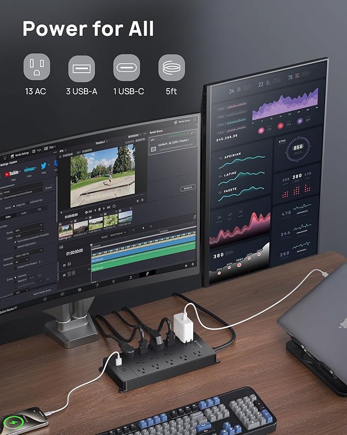 - 13 widely spaced AC outlets - Extra space in-between(38mm vs. 30mm on other power strips) can provide room for large plug adapters without blocking adjacent outlets. Easily plug in your PC, monitor, printer, TV, android box, echo & more
