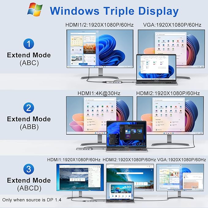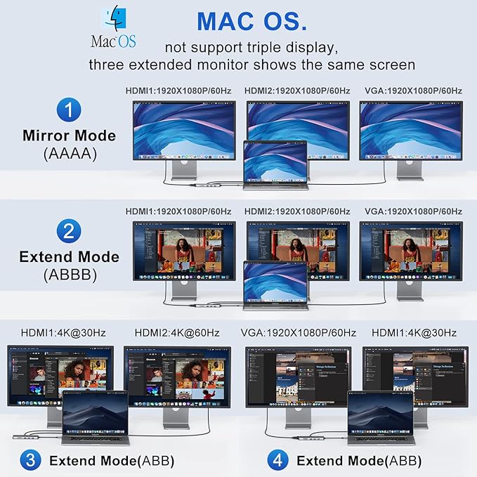 - Triple Display Docking Station: Support SST & MST for Windows OS, you can mirror or extend with crystal clear 3D visual and high quality video experience through 2 HDMI ports and 1 VGA, HDMI resolution will be 4K@30Hz (while DP1.4 source) if two monitors play simultaneously. Display output will be 1080P@60Hz when dual or triple display with VGA. (Single use HDMI 2 can up to 4K 60Hz under DP1.4 source);(β€NOTE: All external monitor images are same on MacOS. due to OS system limit).
