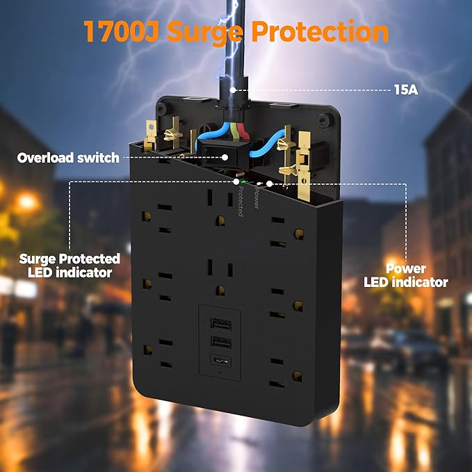 - 1700J Surge Protector Outlet: Equipped with surge protection and overload protection and ect, Reliable on/ off switch can automatically shut off and protect your expensive electronics, providing you with a safe and reliable charging environment