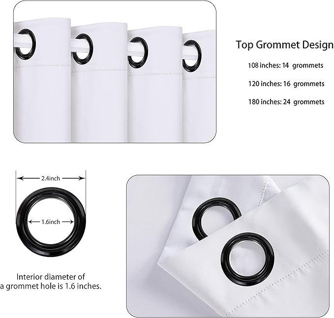 - WHAT'S IN THE PACKAGE? Each set includes 1 curtain panel, and each window drape measures 96-inch (8 ft) length by 120-inch (10 ft) width. 14 elegant metal grommets with 1.6-inch inner diameter, fit well with standard or decorative curtain rods, which makes the curtains easy to install and slide.