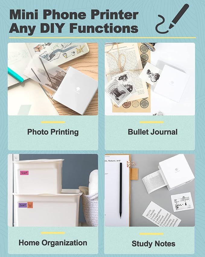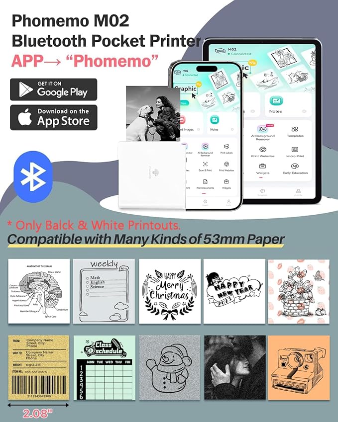 - Multi-Purpose Mini Printer- Phomemo M02 mini sticker printer is suitable for company business, work planner, office assistant, memo, study notes, shopping list, receipts, bookmarks, greeting cards, alphabet learning, coloring and so on. You can use it for DIY, study, fun, labels and create more
