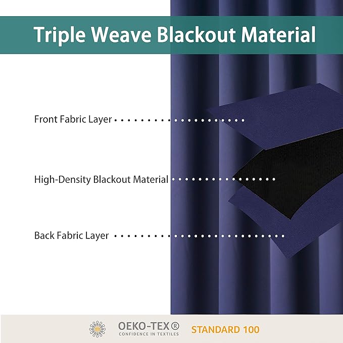 - PREMIUM BLACKOUT MATERIAL: Our room darkening curtain is made of 100% polyester fabric and have the same color with the front and back. Crafted in a certified STANDARD 100 by OEKOโTEX factory from a durable soft and thick triple weave blackout fabric which block out 90% above sunlight and UV rays. Darker colors work better.