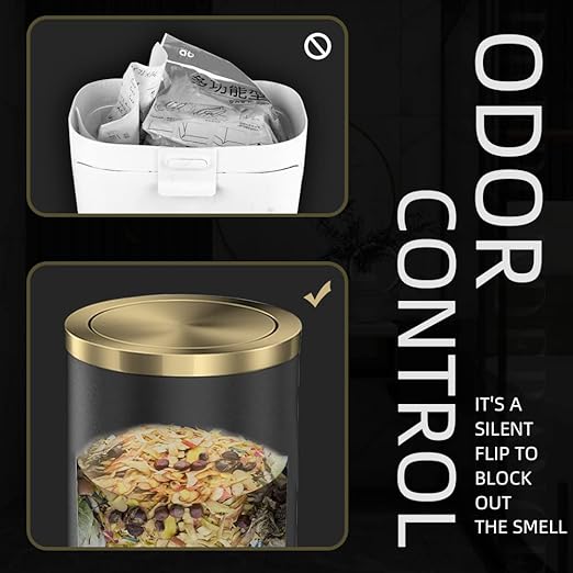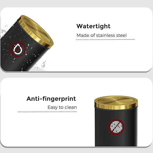 - 【 Perfect Hidden Garbage Bag 】 : This black and gold trash can features an innovative built-in pressure ring design that easily rolls up and fixes the edges of garbage bags, achieving completely hidden storage. The garbage bags are firmly locked in the bucket, saying goodbye to the embarrassment of the edges slipping or being exposed from now on, ensuring that your home space always maintains a neat, beautiful and high-end feel.