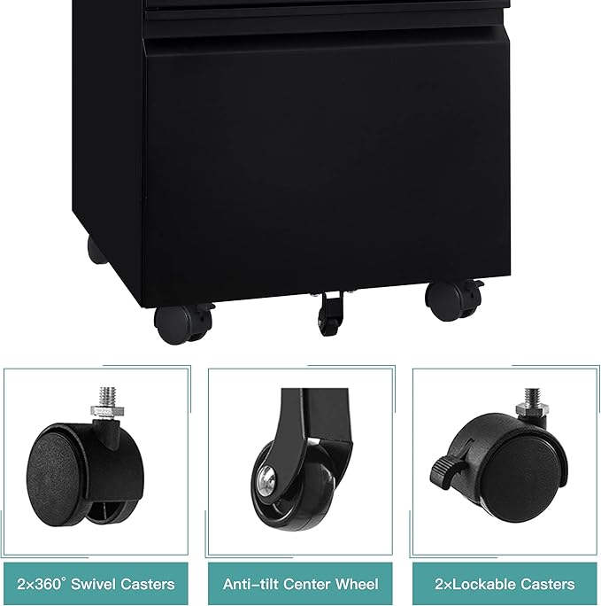 - 【Rolling File Cabinet 】: Equipped with 2 lockable casters + 2 x 360° swivel casters + 1x anti-tilt wheel, you can move it easily and safely. 360° swivel casters go to any direction easily, while lockable casters offer braking and the center support wheel prevents tipping.