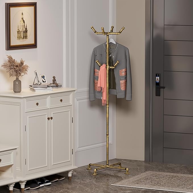Industrial Coat Rack, Metal Pipe Coat Rack Stand Freestanding with 6 Hooks, Heavy Duty Coat Tree Sturdy Coat Racks for Entryway, Hallway, Bedroom (Vintage gold)