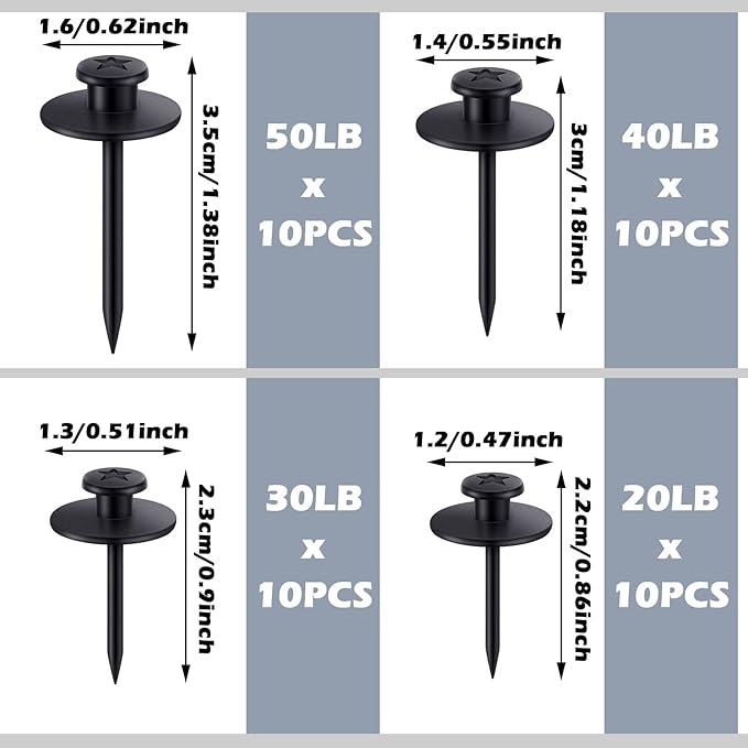- Diverse Weight Bearing to Choose: you will receive 40 pieces of picture frame tacks in 4 different bearing, namely 20lb, 30lb, 40lb, 50lb, which allow you to choose different bearing nails according to the needs of hanging pictures, bringing you a pretty convenience; Sufficient quantity and different bearing can meet your various needs