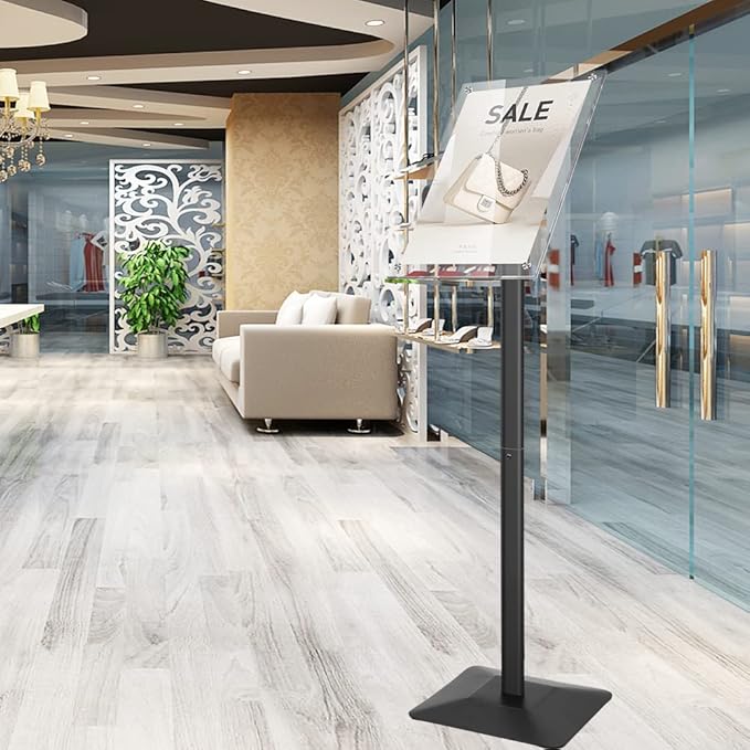 - Multi-angle Display floor stand - Sturdy metal material floor standing acrylic sign holder,the rotating head feature allows the advertisement to be used in portrait or landscape as you like.Our new stylish Floor Sign Holder captures the customer's attention in all frequented traffic areas.