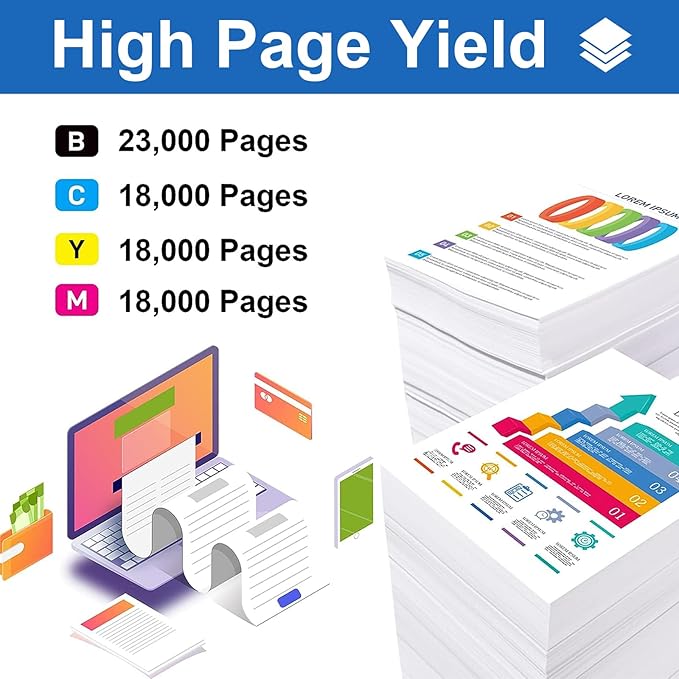 - 【High Print Yield】: LEDES toner cartridge can print 36,000 pages in black, 19,000 pages in colorful (Based on the industry standard 5% page coverage).