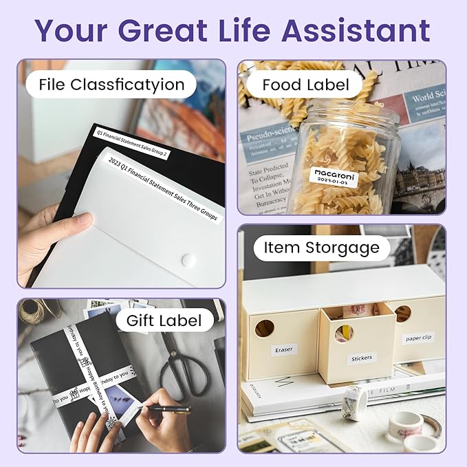 - Wide Application - The Phomemo D30 Sticker Printer is perfect for organizing home supplies (storage, food date marking, cosmetic classification, jar stickers), school supplies (name labels, study notes, office files), cable and personal item identification, and small business use (price tags, jewelry tags, and more)