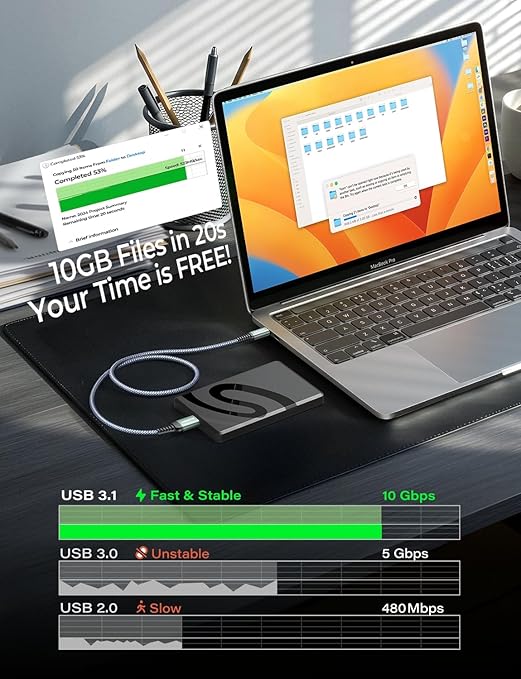 - 【10Gbps Ultra-Speed Data Transfer】Engineered for ultimate efficiency, this USB C to Micro B Seagate External Hard Drive Cord delivers blazing-fast 10Gbps data transfer – 10x faster than USB 3.0 and 20x faster than USB 2.0. Transfer a 10GB HD movie in just 20 seconds, ideal for photographers handling 4K RAW files, professionals managing massive backups, or gamers who need an external hard drive to expand storage, ect.