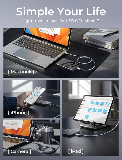 - 【USB-C Ready for Modern Devices】This USB C to Micro B external hard drive cord works flawlessly with MacBook Pro/Air, iPad Pro, iPhone 16/15, Dell XPS, Galaxy S25-S8, OnePlus, and other USB-C hosts. One cable for all your tech—simplify your setup.
