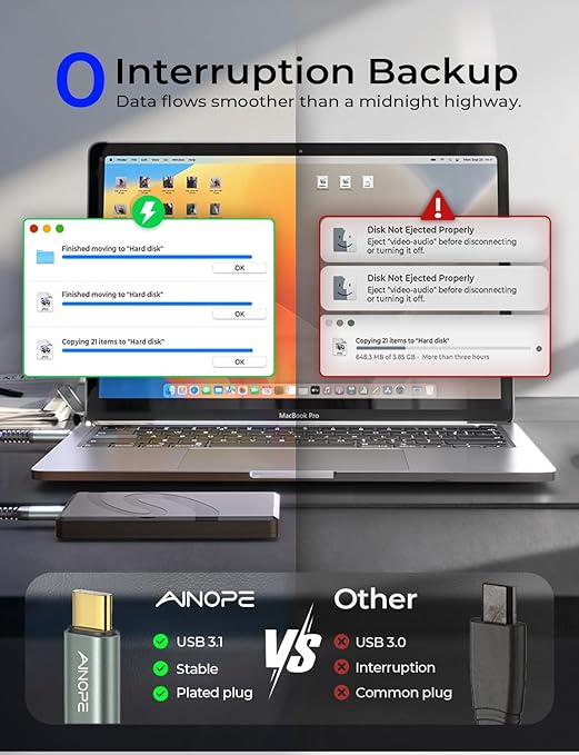 - 【Rock-Solid Stability】Tested by 600+ certified labs, this Micro B to USB C External Hard Drive Cable features triple-shielded protection (internal grounding wire + silver foil + FM-PE braiding) to minimize interference and maintain stable data transfer—even during extended Time Machine backups. The gold-plated connectors help reduce signal dropouts, supporting 20+ hours of continuous backup without disruptive pop-up warnings. Focus on your work while your files transfer smoothly in the background.