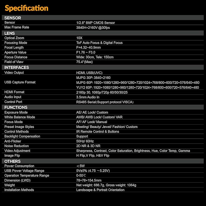 AVMATRIX Live Streaming Camera 10X Optical Zoom 75.4° Wide Angle ToF Auto Focus FHD 1080P 60fps Streaming Camera with USB3.0 & HDMI Out Work with OBS Zoom Teams YouTube/Twitch/Facebook Eagle T10