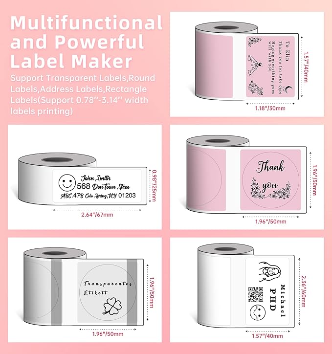 - Thermal Label Maker Printer: Phomemo m220 label maker use direct thermal thechnology, print without ink,toner. Keeping your labels clean, clear.This portable label maker come with 3 rolls labels. (1 Roll 40x30mm black in white label, 1 Roll 40x 30mm rectangle pink label, 1 Roll 50x50mm round pink label οΌ(Attention: The label maker only support printer 0.78''-3.14'' width labels, can't support print 4 x 6 labels)