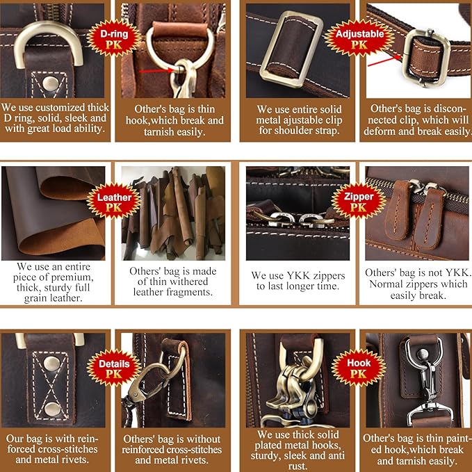 - 【Quality Material】 Made of 2mm thick full grain cowhide leather processed with crazy horse leather technology, this messenger bag is featured with outstanding durability and weathered vintage look. The leather grows brighter and shiny and looks " newer" with age. That's why many people become followers of crazy horse leather bag. Delicate stitches, ykk metal zippers and heavy duty hardware ensures its long usage time