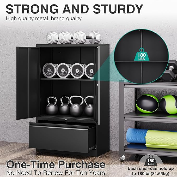 - 【HIGH QUALITY MATERIAL】 The metal file cabinet is integrally formed, using heavy-duty cold-rolled steel plate, the entire metal frame is thickened, more durable, each shelf has a carrying capacity of up to 180 pounds, sturdy & not easy to deform, use with confidence, the metal surface is environmentally friendly & harmless powder coating, easy to clean, prevent Scratch & rust