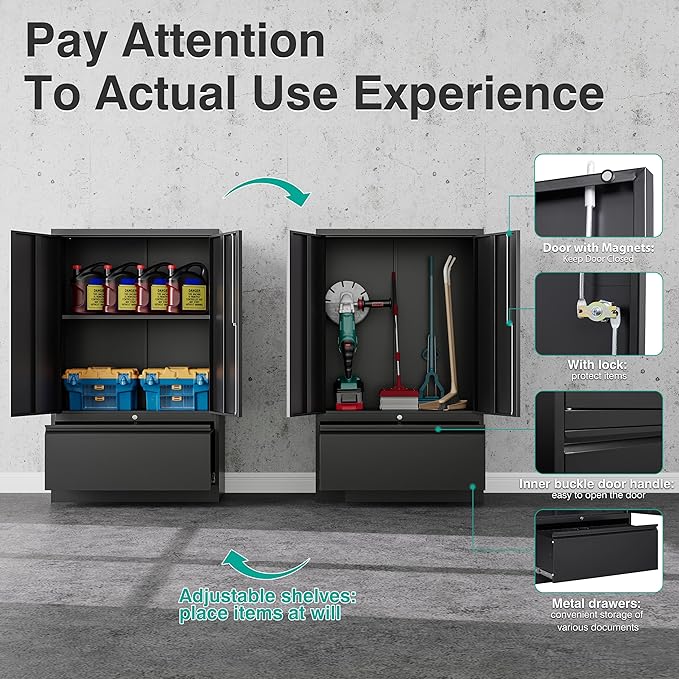 - 【Lockable Storage Cabinets】 Our file cabinet with lock & 1 adjustable shelf for a great fit & convenience. 1 large metal drawers for letter, A4, legal size hanging folders, high end unlocks to protect valuables including keys. Whatever your storage needs, you can create a unique storage space that suits them