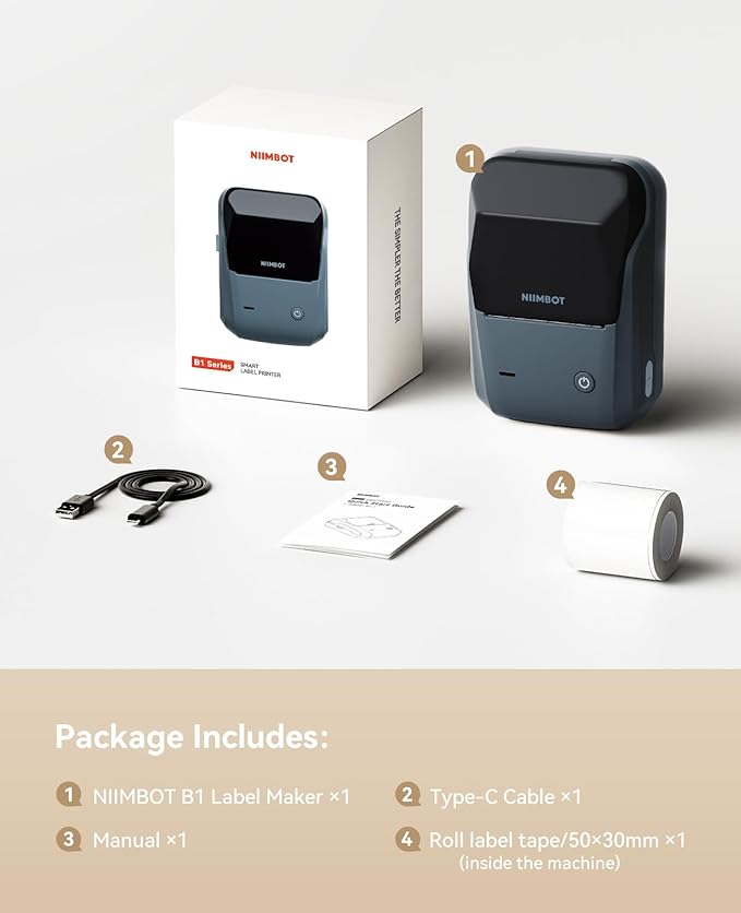 - Various Label Styles Available: The package comes with a roll of 50x30mm label. Besides that, we provide various style label tapes compatible with the B1 label maker, including rectangular, round, cable, file labels, and double-row small labels to suit all your needs.NIIMBOT labels are waterproof, oilproof, wipeable, tear-resistant, self-adhesive, abrasion resistant and BPA free.