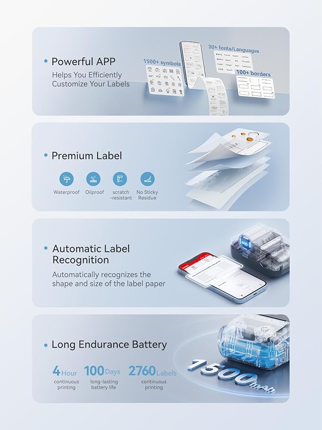 - Powerful APP: The Versatile NIIMBOT App included more than support 10+ fonts/Languages, 100+ borders, and 1500+ symbols, barcodes, QR codes, icons, time, images,table and so on. Besides that, they are some pre-made templates in app, you can directly use or refer to them to design your own lables.