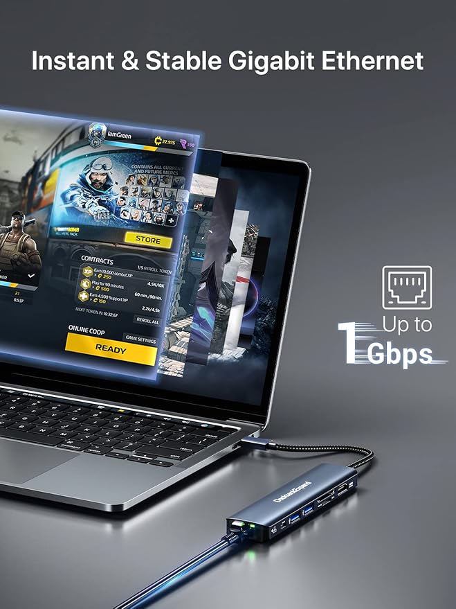 - [ USB C Hub 7 in 1 ] The USB C Hub Multiport Adapter expand your laptop or tablet’s USB-C/Type C/ Thunderbolt 4/3 to 4K@60Hz Port, 1Gbps Ethernet Port, 100W Power Delivery Charging Port, 2 USB 3.0 ports ( up to 5Gbps), and SD/TF card readers ( Up to 104MB/s)