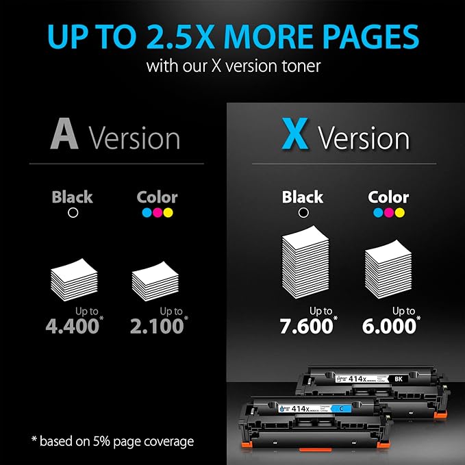- Print More with replacement for HP 414 toner X Version: Up to 7,600 pages per 414X Black, 6,000 pages per X color cartridges (414X Cyan, 414X Magenta, 414X Yellow). Sharp and vibrant prints with Smart Ink cartridge replacement for HP 414X