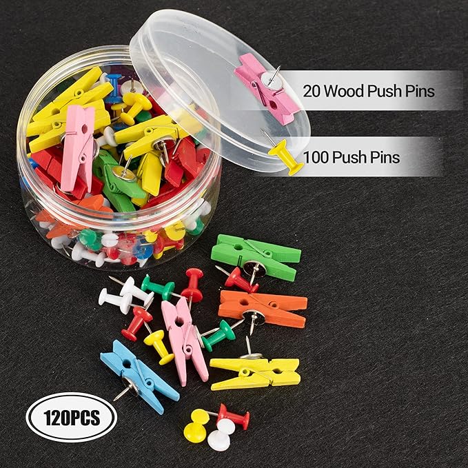 - Corkboard Set: 20 natural wood clips, beautiful and practical, hold more than 30 sheets of office A4 paper; 100 color pins, sturdy and durable, pin important papers and messages to cork boards; 1 plastic box, orderly placement of small parts