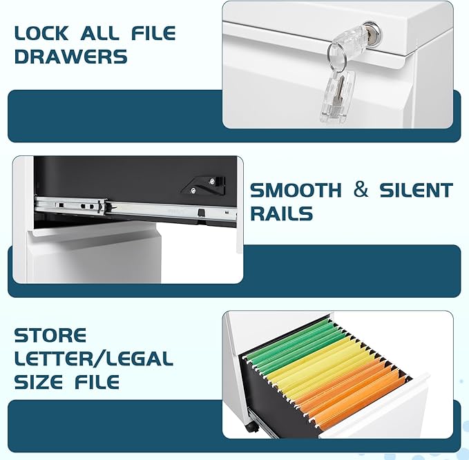 - 【Mobile File Cabinet on Wheels】Equipped with 5 casters, you can move this rolling small file cabinet easily and safely. 360° swivel casters go to any direction easily, while lockable casters offer braking and the center support wheel prevents tipping.