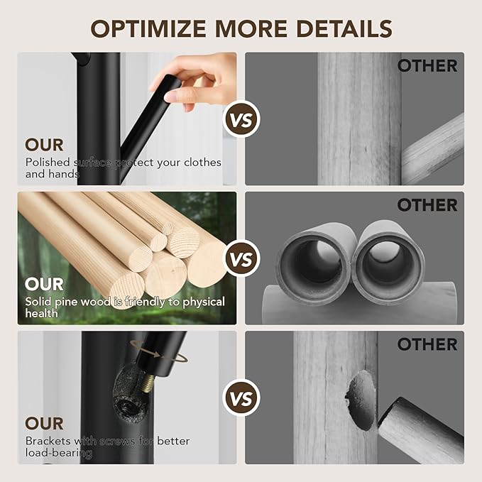 - Unique Craftsmanship: Hupmad freestanding coat rack is made of New Zealand pine wood, which is strong. The columns and hooks have a fine polished surface with a smooth and rounded feel. Protect your clothes from being scratched. The solid wood coat rack retains the natural wood grain and provides a simple and elegant versatile style