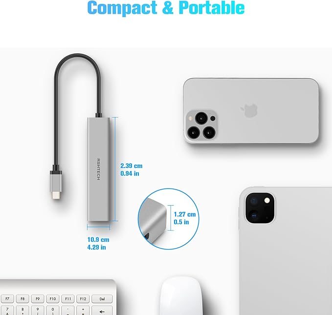 - 4-Port USB C Hub Dongle: RSHTECH 4 Ports USB C Hub Splitter expands your host device's single USB-C port into 4 USB-C 3.2 data ports for hard drives, flash drives, mice, keyboards, and more USB Type-C devices. Plug and play, no driver required. Keep your desktop organized