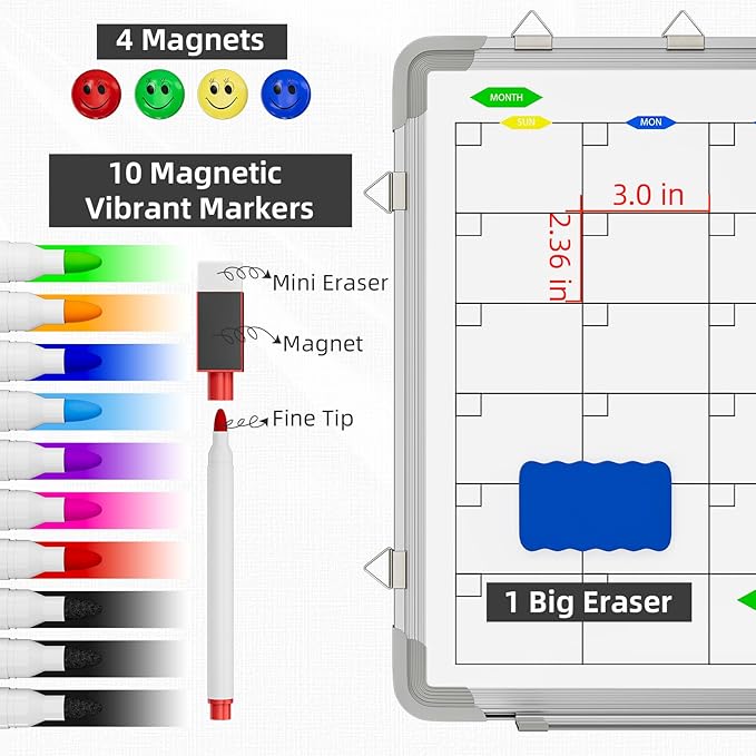 - Large Size & Value Package: The large 24 X 18 inches white board calendar has enough space, can be used as a monthly weekly calendar planner, message or memos board! Wall calendar dry erase board comes with 10 pcs magnetic markers (include 8 color), 4 pcs magnets, 1 pack big dry eraser. Use different colored markers to signify events, appointments, or assign a specific shade to household member/workmate! TIP: Please tear off the clear plastic film before use.
