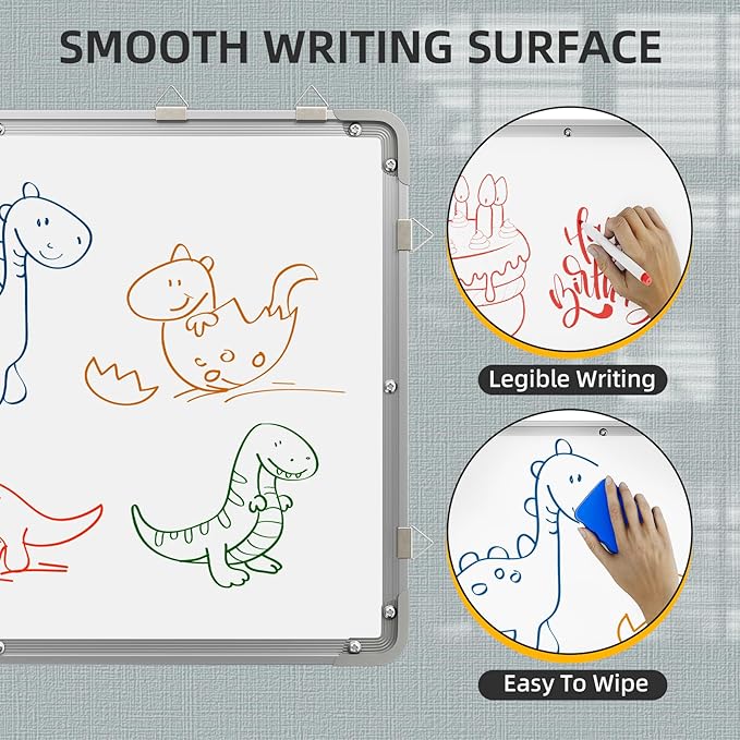 - Upgraded Durable Calendar Whiteboard: Large dry erase calendar for wall use aluminum frame and plastic corners, which can maintain the solid shape of the white board while avoiding the potential finger hurts. The included tray could better hold large eraser and markers. The movable hooks can be adjust the hanging distance, you can set up dry erase board calendar either horizontally or vertically. Strong magnetic surface for attaching notes, pages, documents, photos, graphs and cards on.