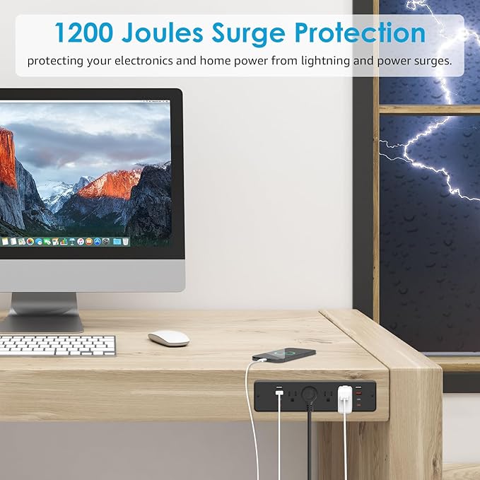 - Recessed Surge Protection with Flat Plug: With 1200 Joules surge protection, the power outlet withstands spikes and fluctuations, protecting your electronics and home power from lightning and power surges. It has all the power a person would reasonably need at their desk or work station, create less clutter and have a more organized desk area, in use and that it is not taking up floor space or counter space.