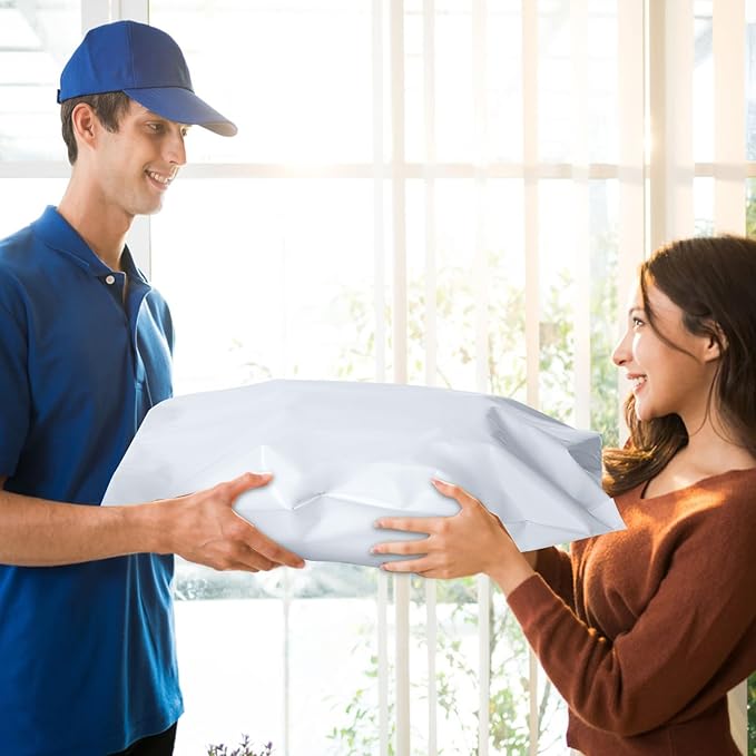 - Eye-Catch Poly Mailers Bags--- Usable size: 19x24 Inch, 100Pack. These shipping bags have a white outer surface, and gray inner lining, a highly attractive color that makes your products look better. Their smooth texture makes it easy to affix self-adhesive stamps and address labels, helping you customize your brand.
