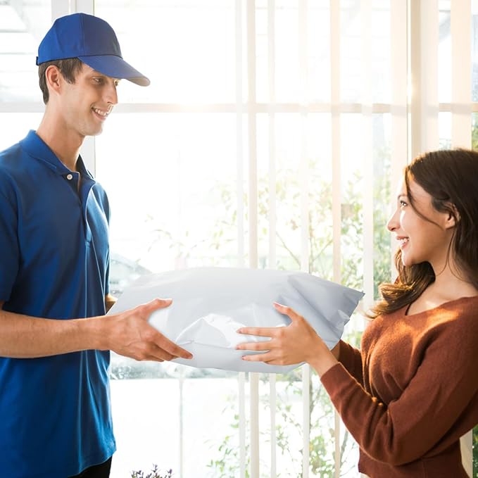- Eye-Catch Poly Mailers Bags--- Usable size: 24x24 Inch, 50Pack. These large shipping bags have a white outer surface, and gray inner lining, a highly attractive color that makes your products look better. Their smooth texture makes it easy to affix self-adhesive stamps and address labels, helping you customize your brand.