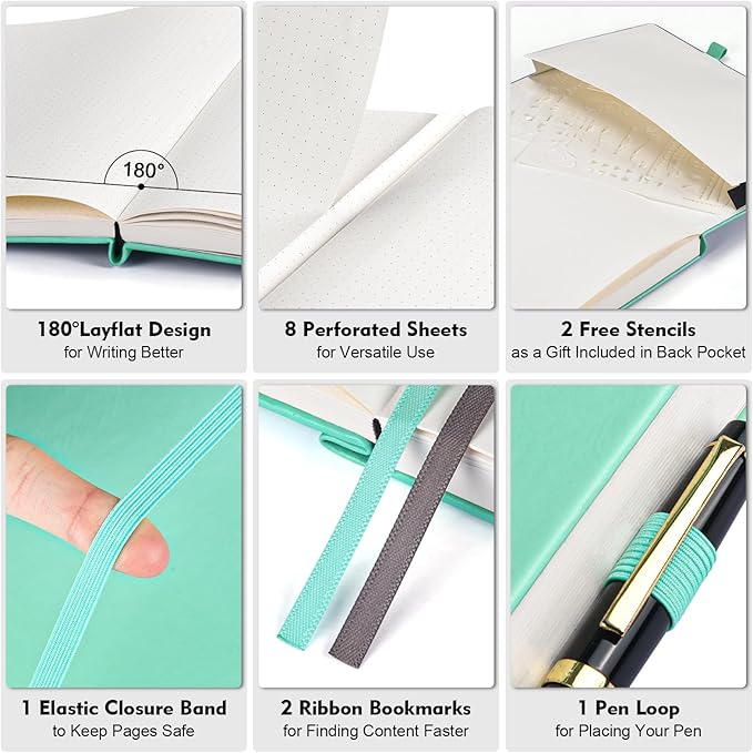 - 【User-Centered Design】❶ Add 2 subtle markers on the pages to assist with QUICK PAGE LAYOUT, allowing you to easily locate the center of rows and columns without counting every time; ❷ Include all the essential features of a perfect dot grid journal, such as 8 perforated sheets, 2 bookmarks, elastic closure band, pen holder, and back pocket; ❸ BONUS - 2 stencils are being gifted to you to create your ideal bullet point journal.