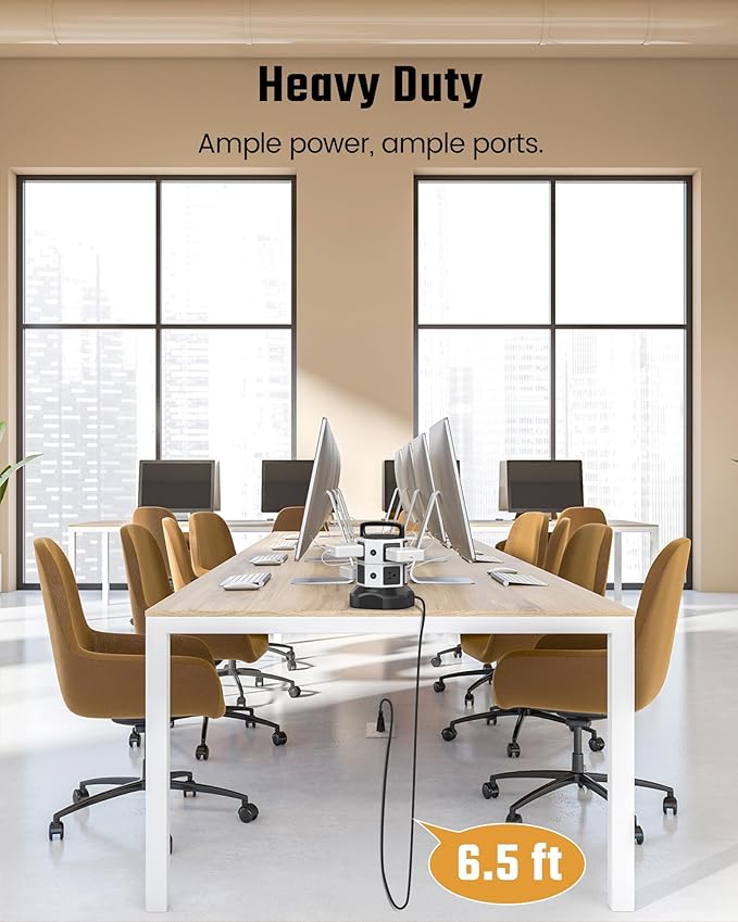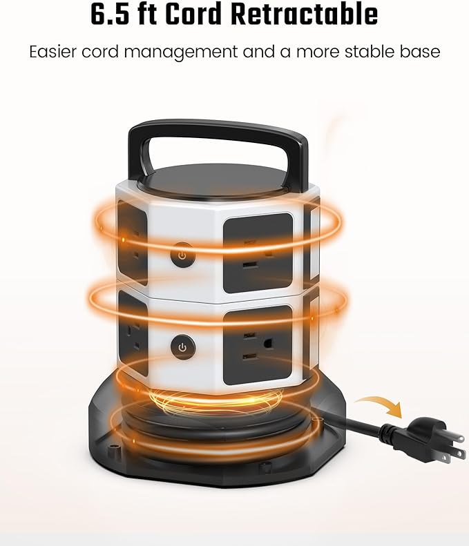 - ▶【Retractable Cord】With the 6.5ft pure copper retractable extension cord, you can roll up the cord by rotating the tower, which tidies up your desk and you can set the cord length to your need. A handle on the top is for convenient carry.