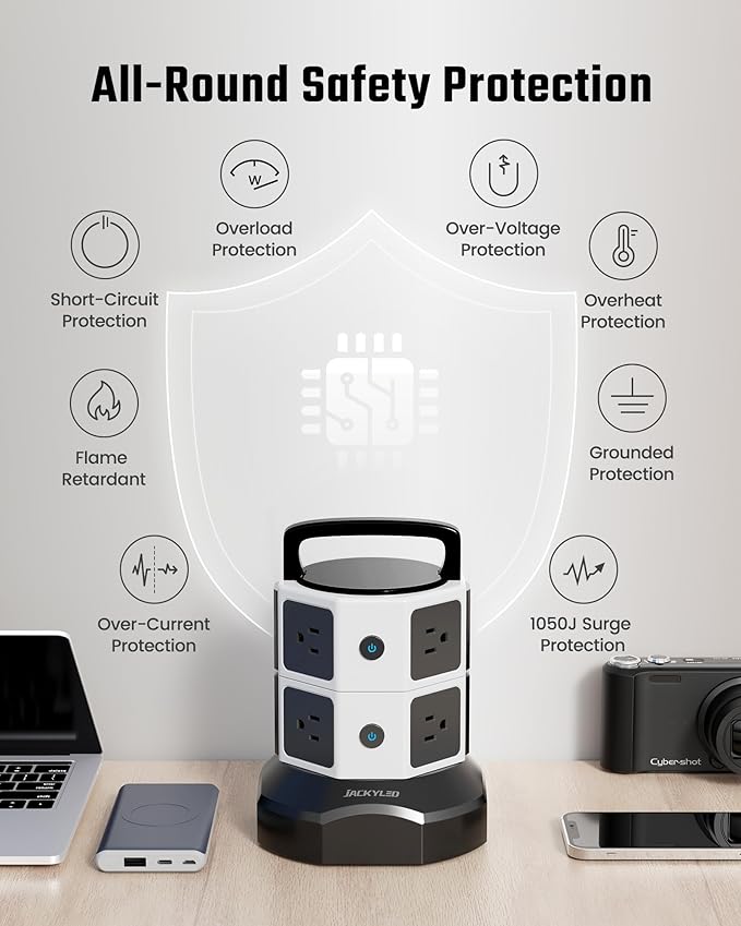 - ▶【2 USB-C & 2 USB-A Charging Ports】Tired of searching for adapters when the phone battery is low? With 2 USB-C ports and 2 USB-A ports, JACKYLED USB power strip tower is here to simplify your charging needs. The inbuilt smart charging technology empowers the USBs to intelligently detect your electronic devices and charge them at optimal yet safe speeds—compatible with most USB devices. (USB-C: 5V⎓3A, USB-A: 5V⎓2.4A)