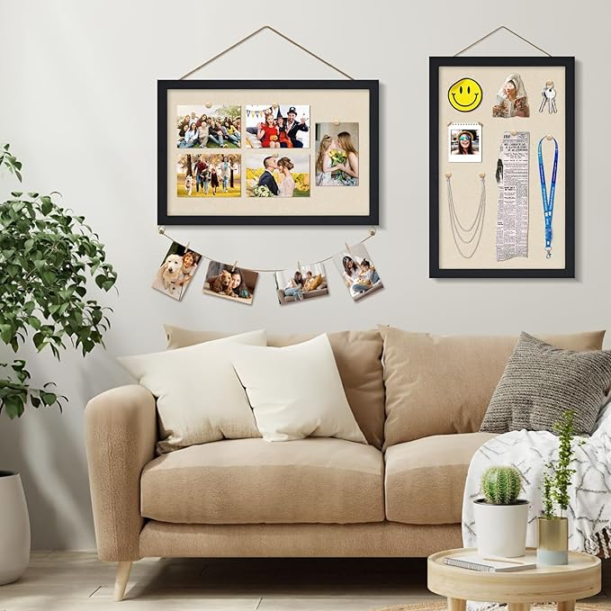 - Complete accessories: The 16x11 pin board comes with three triangular metal hooks, allowing you to hang the frame horizontally or vertically on shelves and walls. 20 wooden pins, 8 wooden clips, 4 gold hook nails, 3 screws, and 4 hemp ropes, providing you with a range of personalized decoration combinations.