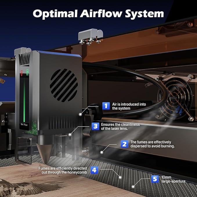 - Say goodbye to multiple trials and errors: equipped with a Lightburn-compatible camera, positioning your project is a breeze. Plus, with a power indicator bar, fault reporting light, and airflow detection, this machine puts you in control.