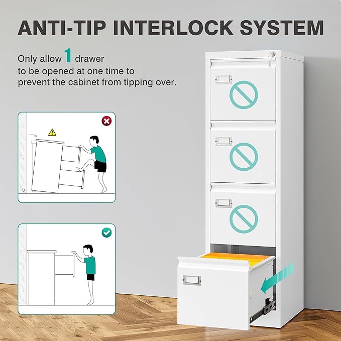 - SECURE STORAGE: 4 drawer filing cabinet with lock features a built-in lock system with keys to protect sensitive documents and valuables.Anti-tip interlock system allows only one drawer open at a time.Plus label holders for easy file identification.