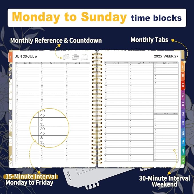 - Weekly View: 2-page weekly layout from Monday to Sunday, 15-minute time slots in increments from 7:00 a.m. to 8:45 p.m. on weekdays, and 7:00 a.m. to 8:30 p.m. on weekends, 3-month reference previews, allowing you to manage time and track appointments easily.