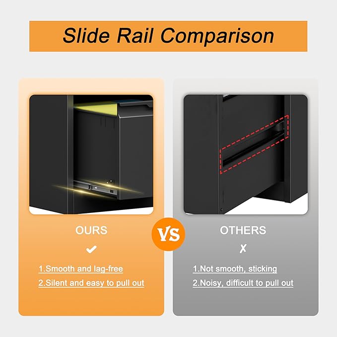 - 🔖【SMOOTH MUTE SLIDE RAILS】: Our metal file cabinets are made with full retractable mute slide rails, open and close smoothly, easy to pick up and put down folders without noise. Perfect for office, home and school use. And the vertical appearance design can maximize the effective use of space, so that your space is not wasted!