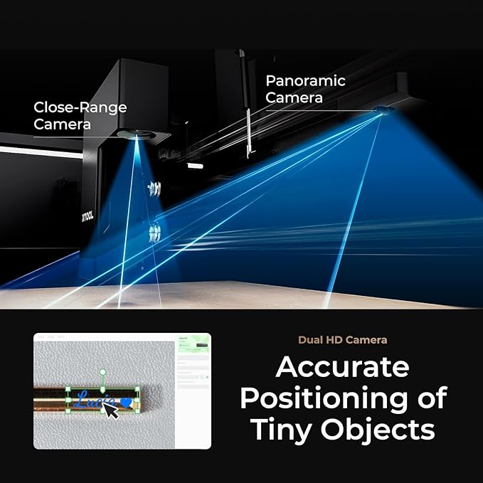 - Intelligent Desktop Laser Cutter & Engraver: Thanks to the dual 16MP smart cameras, xTool P2 CO2 laser engraver can automatically construct 3D models of curved objects to make curved surface engraving as perfect as flat, can intelligently recognize shapes to fill pattern on multiple objects and engrave them in one batch. If assembled with the Automatic Conveyor Feeder, xTool P2 also provides the automatic passthrough for precision and convenience when engraving and cutting extra-large materials.