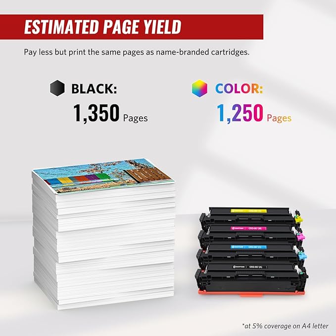 - [ESTIMATED PAGE YIELD] 1350 pages per Black toner cartrige, 1250 pages per Color toner cartridge on 5% coverage (letter/A4).