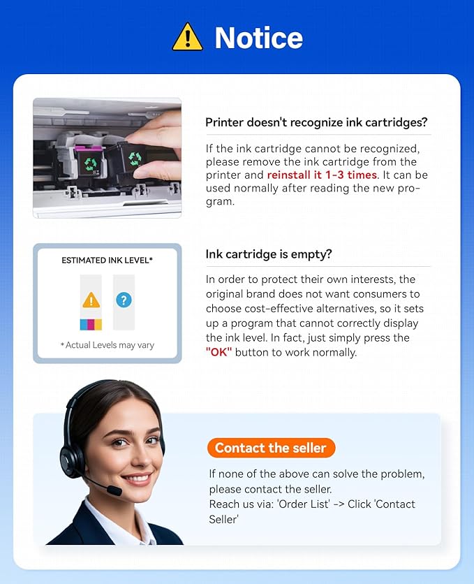 - Warm Tips: When occur an error message "Replace Cartridge" or "low ink"? Please reinstall them and try, you can try up to 3 times