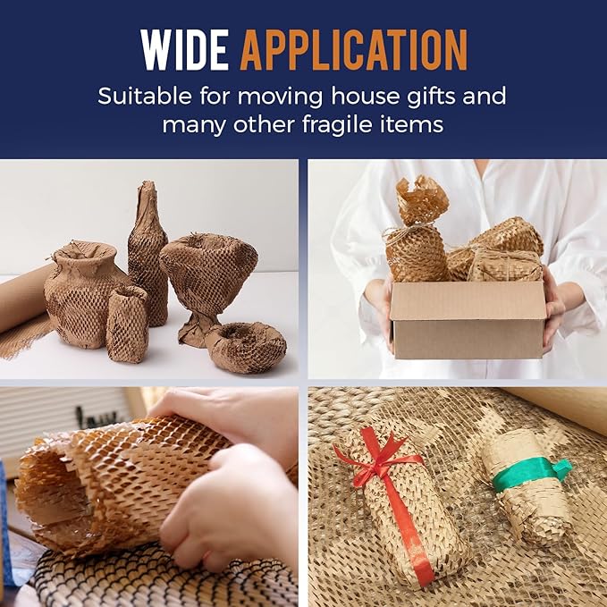 - Certified FSC C204227 Eco Friendly Shipping Supplies: Say goodbye to large bubble wrap roll! Our honeycomb wrapping paper for moving essentials offers an eco-conscious alternative. Crafted from 100% recyclable packing materials. This gentle packing paper sheets for moving comes with Jute Rope and keeps your items safe in transit