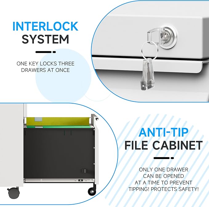 - 🌟【SECURE INTERLOCKING SYSTEM】This metal file cabinet uses an interlocking device. One lock can lock all drawers at the same time to ensure the safety of all drawers. In case of loss, we are equipped with two keys. Keep your documents, important items safe and organized.